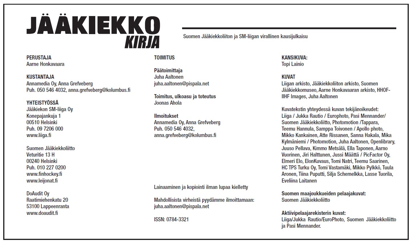 Näin seitsemäntenä ilmestymisvuotena en voi liikaa kiittää SM-liigaa, Jääkiekkoliittoa ja kaikkia kirjaan ilmoituksen laittaneita yrityksiä. Ilman näiden kolmen anteliasta panosta kirja ei ilmestyisi.